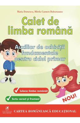 Caiet de limba roman. Auxiliar de achizitii fundamentale pentru ciclul primar Pentru incepatorii in scrierea pe dictando, caietul vine in ajutor cu o liniatura care sa asigure marimea uniforma a literelor, asigurand claritate si lizibilitate prin exemple simple si usor de inteles. El se adreseaza perioadei postabecedare. Invatatorul il poate folosi spre sfarsitul clasei I sau in clasa a II-a, in functie de potentialul clasei, sau drept caiet de caligrafie la ora de optional. – Autoarele