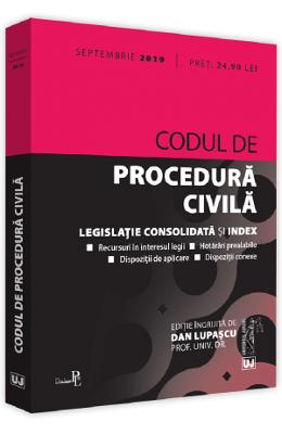 Editia a 7-a a lucrarii Codul de procedura civila (septembrie 2019) , tiparita pe hartie alba de calitate superioara, ingrijita de prof. univ. dr. Dan Lupascu, contine textul Codului de procedura civila actualizat si completat cu dispozitii conexe si de aplicare, cu recursuri in interesul legii și cu hotarari prealabile, necesare unei depline intelegeri a reglementarii. Indexul plasat la finalul Codului faciliteaza utilizarea acestuia, indicand sediul materiei pentru diverse institutii importante in domeniul procedurii civile si asigurand o cautare rapida a cuvintelor-cheie corespunzatoare. Lucrarea Codul de procedura civila: septembrie 2019 este destinata nu doar practicienilor si studentilor, ci si teoreticienilor.