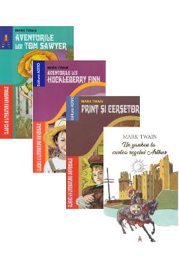 Pachetul contine 4 carti : -Aventurile lui Tom Sawyer (240 pagini) -Aventurile lui Huckleberry Finn (310 pagini) -Print si cersetor (208 pagini) -Un yankeu la curtea regelui (336 pagini) • Aventurile lui Tom Sawyer Aparut in 1876, romanul Aventurile lui Tom Sawyer este considerat literatura pentru copii, dar este citit cu interes si de catre adulti care, astfel, isi aduc aminte de anii copilariei. Personajul principal este chiar intruchiparea autorului de pe vremea cand era copil, unii dintre eroii povestirii sunt fosti colegi de scoala, oraselul St. Petersburg este o denumire fictiva a locului unde s-a nascut, amicul sau bun, Huck Finn, este modelul unui prieten. Aventurile lui Tom Sawyer sta la baza publicarii altui roman, Aventurile lui Huckleberry Finn , aparut in 1885, car …