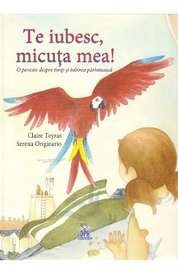 Te iubesc, micuta mea! O poveste despre timp si iubirea parinteasca Alisa se simtea tare singura de cand mami a plecat sa-l ingrijeasca pe bunicul sau bolnav, dar si pentru ca tati pleca la munca dis-de-dimineata si se intorcea tarziu in noapte. Intr-o zi, o pasare superb colorata a aparut la fereastra ei: era un papagal vorbitor! Alisa a inceput sa il invete diferite cuvinte, apoi fraze, pe care acesta le repeta voios. Putin cate putin, in timp, papagalul repeta incontinuu cateva cuvinte, dar pe care nu le-a invatat de la Alisa. Erau cuvinte frumoase, induiosatoare, dar oare unde sa le fi auzit papagalul? O poveste plina de duiosie despre iubirea neconditionata a parintilor, exprimata deseori de acestia chiar si atunci cand copilul nu ii aude.
