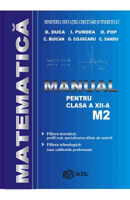 Matematica M2 pentru clasa a XII-a • Filiera teoretica: profil real, specializarea stiinte ale naturii • Filiera tehnologica: toata calificarile profesionale Autori: Dorel Duca, Ioan Purdea, Ovidiu Pop, Cristian Buican, Ovidiu Cojocaru, Cornel Sandu Manualul este structurat in 7 capitole. Fiecare capitol dezvolta o parte teoretica, sustinuta de exemple si probleme rezolvate, iar la sfarsit contine probleme propuse spre rezolvare si cel putin un test pentru verificarea cunostintelor aferente capitolului respectiv. Temele abordeaza toate competentele prevazute de programa scolara. Problemele si testele propuse spre rezolvare sunt insotite de indicatii si raspunsuri la finalul manualului.