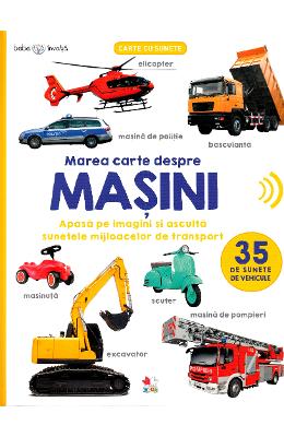 Bebe invata. Marea carte despre masini. Carte cu 35 de sunete de vehicule. Apasa pe imagini si asculta sunetele mijloacelor de transport Cum suna o sirena? Ce zgomot face excavatorul? Si cum se aude avionul la decolare? Fotografiile de foarte buna calitate si sunetele adevarate le ofera copiilor ore intregi de joaca in care descopera lumea!